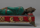 This Sleeping Buddha Statue is a beautiful and unique representation of a sleeping figure made from brass and adorned with gemstones. The figure is depicted in a relaxed and peaceful pose, with its right hand resting on its head. The gemstones add an extra element of beauty and sparkle to the piece, catching the light and creating a mesmerizing effect. This statue would be a lovely addition to any home or meditation space, bringing a sense of calm and serenity to its surroundings. Whether you're a collector of spiritual art or simply looking for a beautiful piece to display, this sleeping figure is sure to impress.
