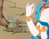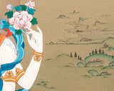 Our artist has hand-painted a small Buddhist thangka of Avalokiteshvara in the traditional Karma Gadri style. The deity is represented beneath the beautiful tree, seated on a moon disc lotus seat with a tranquil face. Enlightenment artisans meticulously painted this thangka with genuine 24k gold and acrylic colors. A translucent halo illuminates his face, and flowing robes and jewels engulf him. The artist of Nepal extensively paints precious ornaments and pearls. The art of Nepali thangka has been passed down through the generations as a reflection of Buddhism.
