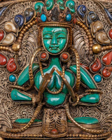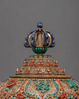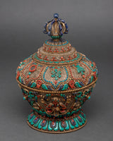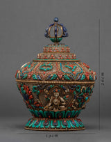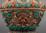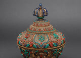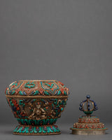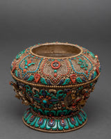 This rice bowl is hand-carved. It has complex filigree hand carvings, or "siko carvings." At the top, there is a half vajra placed. The Rice pot is finished with coral, turquoise, lapis, and crystal stones to give it a rich and sensual appearance. The Rice Bowl (Gulpa) is decorated with exquisite carvings carved from various stones to give it a fantastic appearance and patterns. At the pot, there is the auspicious symbol carved. At the bottom Buddhist deity are carved with different crystal stones.