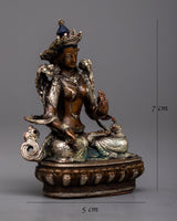 Discover the Small Machine Made White Tara Statue, a representation of longevity, healing, and serenity. Standing at 7cm in height, this magnificent item is finely fashioned on an oxidized copper body and embellished with a delicate silver plating. The statue's rusted copper gives depth and character, while the silver plating highlights White Tara's calm and kind nature.