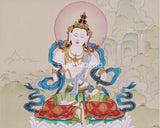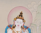 This finely crafted Thangka features Vajrasattva, also known as Dorje Sempa, a pivotal deity in Vajrayana Buddhism renowned for his purification and transformative qualities.