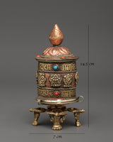 This Spinning Mantra Wheel, a handcrafted Tibetan Prayer Wheel with a copper and brass body, will bring serenity and spiritual harmony into your environment. This compact yet potent ritual object measures 14.5 cm in height and 7 cm in width, making it ideal for personal altars, meditation rooms, or spiritual home design. The prayer wheel's body is elegantly fashioned from copper and brass, representing purity and strength, and it is embellished with religious mantras that have been delicately carved and inlaid with ornamental stones. The smooth spinning motion of the wheel is thought to activate the blessings of the mantras, sending waves of positive energy, protection, and compassion into the environment.