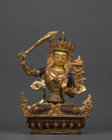 Manjushri is depicted holding the flaming sword of wisdom, symbolizing the cutting through of ignorance, and the Prajnaparamita Sutra, embodying ultimate knowledge. This exquisitely detailed statue, with its serene expression and ornamental design, serves as both a profound object of devotion and a masterpiece of Buddhist art.