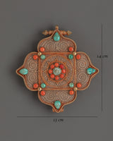 This Ghau box locket, measuring 14 cm in height and 13 cm in breadth, is an ideal blend of art and practicality. The copper structure and gorgeous gold plating are complemented by the vibrant turquoise and coral stones, which enhance the overall aesthetic appeal. Whether worn as spiritual jewelry or presented as a decorative object, this Tibetan Ghau Box Locket is a stunning addition to any collection. Embrace spiritual harmony with this one-of-a-kind, handcrafted pendant, perfect for meditation, giving, or personal reflection.