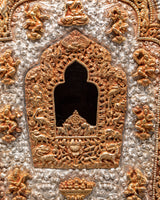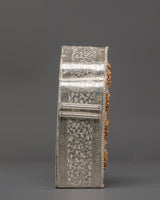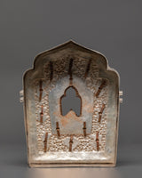 At the center of this shrine is a beautifully carved niche containing a sacred god figure who represents the embodiment of spiritual strength and guidance. In Tibetan Buddhism, deities placed within a Ghau Box are chosen with great care, frequently representing compassion, knowledge, and protection. The presence of the deity within this box transforms it into a living altar, allowing practitioners to invoke blessings, contemplate on heavenly characteristics, and carry the protective force of enlightened beings with them wherever they travel. The gold plating enhances the celestial image, while the silver surface exudes purity, transforming this Ghau Box into an artistic and spiritual treasure.
