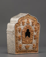 This Spiritual Buddhist Ghau Box is a masterpiece of Himalayan metal artistry, standing 23cm tall, 19cm wide, and weighing 1.23kg. It has a copper base and is beautifully embellished with pure silver repoussé designs and bright gold plating. It features complex floral and symbolic motifs. The outside frame has auspicious figures, protecting guardians, and elaborate designs that represent blessings and spiritual protection. Ghau boxes are traditionally valued as both portable shrines and protective amulets, used to transport religious artifacts, mantras, and god images throughout journeys and rituals.