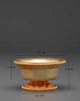 The Spiritual Buddhist Ritual Offering Bowl Set is a beautiful and precious complement to any spiritual or meditation environment. Each bowl is meticulously designed, with a copper body that has been intricately gold-plated for a polished finish. These offering bowls, measuring 3.5 cm in height and 6.5 cm in diameter, are the perfect size for making offerings during Buddhist rites, representing purity and devotion. The interior depth of 2.5 cm guarantees an ideal fit for various offerings such as water, rice, or incense, contributing to the spiritual aura of your altar or meditation space.