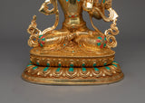 The Manjughosa Statue (Manjushri) is a work of art, standing 12.2 inches (31 cm) tall with a base width of 9.1 inches (23 cm). Crafted with a copper body adorned with 24K gold gilding, enhancing its spiritual appeal. The details are highlighted with gold and acrylic paintings, showcasing the artisan's dedication to fine craftsmanship. Hand-carved gemstones further embellish the statue, adding vibrant and symbolic depth.