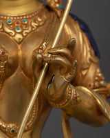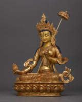 In Buddhist iconography, The sculpture of Dukar is depicted as a serene figure sitting on a moon disc, holding an umbrella for protection from harm and a ritual item for clarity and knowledge. This sculpture symbolizes spiritual fortitude, heavenly protection, and the capacity to eliminate ignorance, bringing enlightenment and inner peace.
