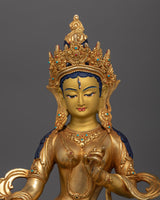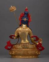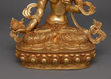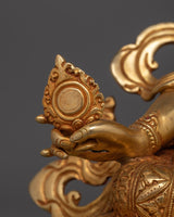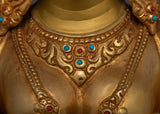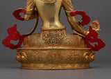 Dukar White Umbrella, a wonderful symbol of protection and compassion, stands 13.6 inches tall, with a 10.8-inch base, and weighs 3.10 kg. This beautiful statue is carved from copper and embellished with 24K gold gilding as well as gold and acrylic paintings, demonstrating the great skill of traditional Tibetan handicraft.