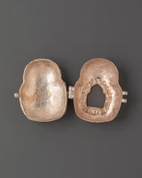 This Tibetan Spiritual Ghau Box is a meticulously handcrafted artifact made from copper and elegantly gilded with both gold and silver, measuring 8.5 cm in height and width. Designed to hold offerings or sacred items during Tibetan Buddhist rituals and prayer ceremonies, it embodies deep spiritual significance. The intricate gold and silver gilding not only enhances its beauty but also symbolizes purity, enlightenment, and protection, making it a powerful vessel for your spiritual practice. Whether placed on your altar or used during meditation, this Ghau Box invites positive energy and serves as a meaningful reminder of devotion and spiritual growth. Its timeless craftsmanship and sacred symbolism make it an essential addition to any spiritual collection.