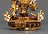 Introducing the Spiritual Green Tara Copper Sculpture, a brilliant representation of the female Bodhisattva known for her protection, compassion, and quick thinking, Green Tara. This sculpture, which stands 8.2 inches tall on a 6.4-inch base and weighs 1.67 kg, beautifully conveys Green Tara's compassionate nature and willingness to help people in need. This item, highlighted by intricate gold and acrylic paintings and made of an oxidized copper body for a timeless finish and 24K gold gilding, represents the unbounded compassion and protective grace of Green Tara.