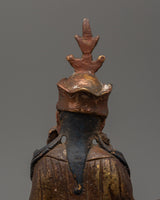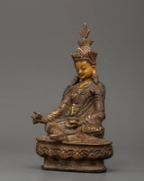This antique-finished copper sculpture exemplifies the creativity and spiritual reverence inherent in traditional Tibetan handicraft. The weathered patina creates a realistic, time-worn appearance that evokes the mystical essence of Himalayan temples. Guru Rinpoche, the Lotus-Born Master, is a renowned tantric teacher who suppressed negative energies and brought Vajrayana Buddhism to Tibet. Placing this statue on your altar, meditation area, or spiritual corner brings blessings in wisdom, clarity, and healing energy. Whether you're a practitioner, spiritual seeker, or Buddhist art collector, this statue connects deeply to ancient teachings and a profound presence that exudes peace, strength, and sacred intention.