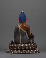 The Spiritual Healing Medicine Buddha is a powerful symbol of health, healing, and compassionate care. This statue weighs 3.77 kg and stands 11.8"/30cm (Height) with a base width of 9.6"/24.5cm, making it a centerpiece for any religious place. The statue is made of oxidized copper, and adorned with gold and acrylic paints. The silver plating adds a touch of elegance, enhancing the figure's spiritual presence. This calm representation of the Medicine Buddha is designed to provide serenity, healing, and protection to those in need, both physically and spiritually.