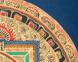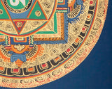 Our thangka is a handpainted Tibetan art done using traditional methods. It is a unique piece created using genuine 24K gold and natural stone colors. This Mandala was created using Natural Pigments & Colors, as well as Gold Leaf, on Cotton Canvas. And is ideal for meditation and home and office decoration.