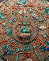 This wonderfully handcrafted Spiritual Meditation Wall Hanging will add a profound sense of tranquility and spiritual elegance to your space. This fantastic artwork, measuring 30cm in height and 29cm in width, makes an excellent focal point for meditation rooms, yoga studios, spiritual sanctuaries, or any other location dedicated to mindfulness and inner peace. This wall hanging, crafted from copper, silver, and gold plating, is adorned with genuine natural stones, including lapis lazuli, turquoise, and coral, each carefully selected for its spiritual significance and energetic properties.