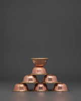 Crafted from copper, these bowls are used to symbolize the seven offerings: water for drinking, water for washing, flowers, incense, light, perfume, and food. Used during puja, meditation, or spiritual practice, this set helps cultivate generosity, purify karma, and deepen devotional focus. Whether for personal use or temple display, this offering set enhances any sacred space with purpose and authenticity.