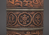 The Spiritual Prayer Wheel is a traditional Tibetan Buddhist object used for meditation and spiritual practice. This prayer wheel measures 27.5cm in height, 12.5cm in width, and weighs 0.53kg. It is crafted from copper and brass embellishments, reflecting the traditional craftsmanship of the Himalayas. It holds strong symbolic value, reflecting the constant flow of positive energy and blessings through the repetition of mantras engraved or written within it.