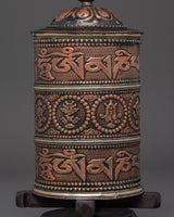 Practitioners utilize this handheld prayer wheel to intensify their prayers and wishes. It is claimed that spinning the wheel releases spiritual blessings, purifies negative karma, and cultivates compassion and knowledge. The smooth spin and balanced weight make it ideal for use during meditation, prayer, or ritual rites. The use of copper and brass enhances its aesthetic appeal while amplifying its spiritual significance.