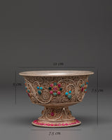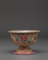 These seven bowls, inspired by Tibetan Buddhist symbolism, represent sacred offerings: drinking water, cleansing water, flowers, incense, light, perfume, and food. Positioned in a line on your altar, they act as a heartfelt welcome to divine entities and enlightened energies. Their delicate filigree and gemstone embellishments add visual beauty and spiritual grace, perfect for daily worship, temple ceremonies, or as a meditative focus in your home shrine.