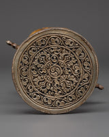 The designs engraved on the stamp are traditional Himalayan iconography, which is frequently employed in Tibetan rituals to promote protection, clarity, and spiritual awakening. Each curve and line is sacred, thought to channel benefits when pushed against ceremonial ingredients or sacrifices. This piece, which combines the bright tone of white metal with the textured integrity of fiber, is both a religio