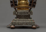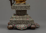 Our folding statue display stand or throne is used to place idol sculptures on your Pooja shrine or in your house. It comprises 100% copper with seku workmanship and medium-quality semi-precious stones. This is a present excellent idea for spiritual practitioners and your home altar.
