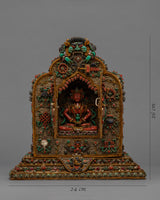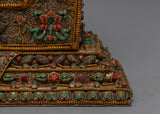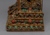 The Statue Crafted Ghau Box is an amazing artwork with a copper body and an auspicious symbol crafted on the outside of the box. The embedded gemstones add an extra layer of beauty and spiritual significance to the piece, enhancing the symbol even more. The box also has a door that is used during prayer to open the box and reveal the sacred statue inside. The box's intricate craftsmanship and meaningful symbol make it an essential item for Tibetan Buddhists, as it is frequently used to hold sacred objects and amulets. The statue inside the box is thought to provide protection and blessings to the devotee who carries it, thus making it useful.