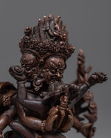 With the help of the machine, we produced this fascinating Statue for Vajrakilaya Puja. The god is pictured here with his consort, Khorlo Gyedunma. It is made up of 3 heads and 6 arms. He holds the three-bladed phurba dagger in his two hands, which is magical. One of the three main barriers to spiritual consciousness is removed by the three blades of the Phurba dagger. The body of the figure was made of molded oxidized copper. Thanks to its antique finish, this piece of art has an alluring appearance.