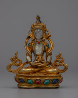 Amitayus, of the Aparimitagunasamchaya or Amitavyhavat pure realm, is commonly depicted in his apparitional buddha form (sambhogakaya), which is crimson in hue, wearing a crown and jewels, and holding a long-life vase in a meditation gesture over two hands.