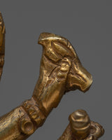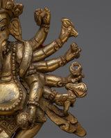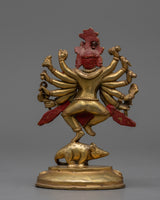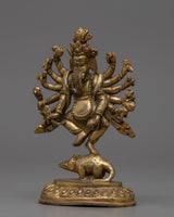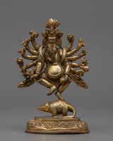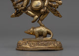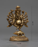 This Ganesha statue is a lovely handcrafted copper item. Lord Ganesha is seen in the statue standing gracefully on his vahana, the mouse, with one leg lifted. The elaborately carved copper statue has six arms, each carrying a different object. The statue also has fine details such as Ganesha's trunk and ears, as well as his elegant headgear. Overall, this copper statue is a magnificent depiction of the popular Hindu deity Ganesha.