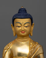 The Vaidurya Prabha Raja (Medicine Buddha) statue, stands at a height of 10.2 inches (26 cm) with a base width of 7.5 inches (19 cm). This exquisite representation is crafted with a copper body and adorned with intricate triple layer 24K gold gilding, enhancing its appearance. The detailing is further enriched with gold and acrylic paintings, showcasing artistry.