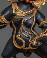 The statue is made of high-quality copper and embellished with colorful acrylic paintings, giving it a tremendous presence. The careful detail emphasizes every element, from Black Dzambhala's furious expression to the beautiful designs on his clothing. This statue, weighing 2.96 kg, is both a visual marvel and a powerful spiritual anchor for any sacred location.