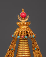 Celebrate the journey toward enlightenment with our Handmade Stupa for Enlightenment, a stunning piece crafted with meticulous attention to detail. Standing 47 cm tall, this sacred symbol embodies Buddhist teachings and the path to spiritual awakening and inner peace. Made from copper with elegant gold plating, it is further enhanced by vibrant turquoise and coral accents that bring both energy and deep spiritual significance. Perfect for meditation spaces, altars, or as a meaningful gift, this stupa inspires mindfulness and harmony, supporting your personal growth and connection to ancient wisdom every day.