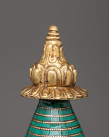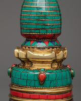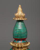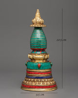 This classic stupa is made of high-quality copper and embellished with imitation turquoise and coral stones with significant spiritual significance. Turquoise, treasured in Tibetan tradition, denotes protection, healing, and spiritual clarity, whereas coral represents life force and devotion. This sacred artifact is excellent for adorning altars and meditation rooms or a thoughtful gift for Buddhist practitioners, collectors, and those seeking spiritual harmony.