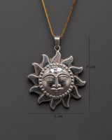 Embrace the sun's vitality with this Sun Face Locket. This pendant is made of 92.5% sterling silver and measures 6cm in height and 5cm in width. The artwork features an artistically carved face of the sun, representing light, optimism, and the essential energy of life. The sun is respected across cultures as a source of warmth, vitality, and strength; thus, this locket is not just a beautiful ornament but also a significant emblem of life's force.