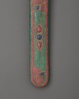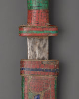 This 0.452kg ritual dagger is expertly constructed from iron and copper and embellished with imitation coral, lapis lazuli, and turquoise stones representing vitality, knowledge, and spiritual healing. The intricate carvings and inlays add to its ritualistic significance, making it a prized possession among Buddhist practitioners, collectors, and those looking for a one-of-a-kind spiritual artefact. This dagger has profound spiritual significance, whether utilised for energy purification, ceremonial gifts, or as a holy decor piece.