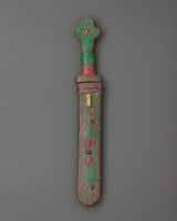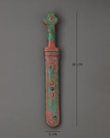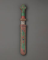 This sword, a ritual dagger, is a strong Tibetan Buddhist ceremonial implement traditionally used to remove negativity, cut through illusions, and invoke heavenly energy. Its handcrafted blade, 36cm tall and 5cm wide, represents wisdom and protection, making it an ideal complement to altar areas, meditation rituals, and holy ceremonies.