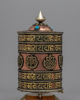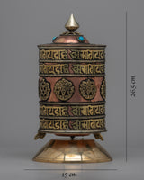 Presenting the Table Prayer Wheel: a masterful combination of handmade copper craftsmanship and spiritual symbolism. This beautiful prayer wheel, which stands 26.5 cm tall, symbolizes spiritual connection and divine blessings.