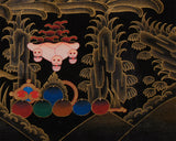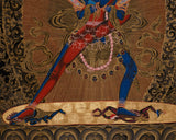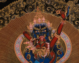 An expert artist carefully hand-painted a striking Chakrasamvara with Consort thangka in Nepal. Rendered on black canvas, it follows the traditional Tibetan painting style, enriched with acrylic colors and genuine 24K gold. The deep black background amplifies the deities' vividness, while gold highlights sacred ornaments, fiery halos, lotus platforms, and symbolic patterns. The design reflects precision, devotion, and mastery in sacred art.
