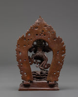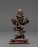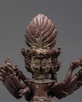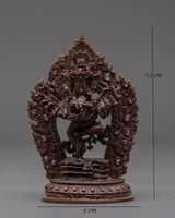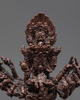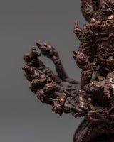 Each detail in this sculpture exemplifies the complexities and devotion of traditional Tibetan craftsmanship, portraying the deity's dynamic energy and sacred meaning. The corroded copper body provides depth and character, making it an ideal focal point for spiritual areas. Whether used for meditation, prayer, or as part of a broader Buddhist art collection, this sculpture is an authentic representation of the Vajrayana Buddhist tradition, contributing to a tranquil, deliberate environment.