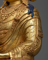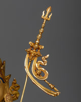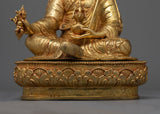 Presenting our "Tantric Padma Rinpoche" statue, a stunning depiction of the legendary tantric teacher. This statue stands 16.1 inches tall and weighs 6.52 kg. It is skillfully crafted from a sturdy copper body and lavishly embellished with 24K gold plating. The gold and acrylic paints highlight the precise features of Padma Rinpoche's tranquil demeanor, ornate tantric costume, and symbolic artifacts he holds, which represent profound tantric insight and spiritual strength.
