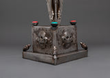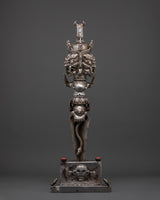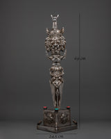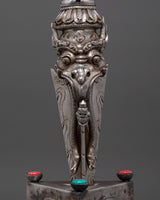 The Tantric Ritual Dagger is a striking ceremonial tool crafted for use in tantric rituals and spiritual protection. Measuring 69 cm in height and 24.5 cm in width, and weighing 11.41 kg, this dagger is forged from iron and adorned with artificial coral and turquoise stones. The iron offers strength and dynamic energy, while the coral and turquoise contribute balance, healing, and protective qualities. This powerful combination makes the dagger an essential instrument for practitioners seeking to safeguard their spiritual space and enhance ritual potency, embodying both physical presence and profound symbolic meaning in every ceremony.