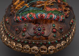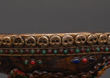 Enhance your sacred environment with this Tantric Spiritual Kapala, a potent ritual skull cup used extensively in Vajrayana Buddhist ceremonies to make symbolic sacrifices. This kapala is 13.5cm tall, 14cm wide, 17cm side width, and weighs 0.65kg. It has a resin skull cup, a finely crafted silver-plated copper body, and a brass support. Adorned with traditional skull designs and bright gemstone inlays, representing impermanence and transformation, which are important elements in tantric spiritual practice.