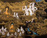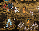 Buddha is seated on the lotus throne in the center of this Buddha Shakyamuni thangka, surrounded by MARA's minions. This thangka empowers comprehension because of the detailed linings in pure 24K Gold and a combination of various Acrylic Colors. We have used an exquisite color palette to paint this thangka, which helps to focus on the central Buddha and the beautifully depicted life stories of him.