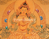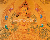 Vajrasattva is shown sitting on a moon disc atop a lotus seat in the vajra position. Holding a vajra (thunderbolt) in his right hand and a bell on his left, he represents the union of wisdom and compassion, communicating the essence of inner transformation and karmic purification. The painting features a delicate five-jeweled crown, a radiant halo, flowing scarves, and ornamentation. The peaceful expression on Vajrasattva's face radiates peace and compassion, inviting viewers to consider the profound teachings of Buddhist philosophy. It is a powerful reminder of the purity at the heart of all beings, making it a valuable spiritual aid for meditation and spiritual practice.