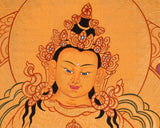 In Tibetan Buddhism, the Thangka of Vajrasattva is a powerful depiction of the spiritual transformation and purification deity. This Thangka is hand-painted on high-quality cotton canvas using acrylic colors that produce rich, bright, and long-lasting hues. Each brushstroke represents the deity's presence, creating a visually appealing composition infused with spiritual force. The details are enhanced with genuine 24K gold, giving the artwork a dazzling brilliance that heightens its spiritual significance. This masterpiece by a talented Nepali artist in traditional Thangka style exemplifies cultural authenticity and skill, making it a timeless addition to any spiritual or meditation setting.