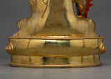 A glowing depiction of the Medicine Buddha, who is regarded in Buddhist tradition as the Buddha of healing and medicine, is the Bhaisajya Guru Buddha Statue. This statue, which stands at a calm height of 13.7 inches and rests on a 9-inch base, is 3.63 kg in weight and represents the deep essence and compassionate force of Bhaisajya Guru. This sculpture, which is made of a copper body and is embellished with 24K gold gilding and intricate gold and acrylic paintings, perfectly embodies the sublime beauty and caring nature of the Medicine Buddha.