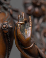 The seven eyes that White Tara has on her face, hands, and soles are what make her so beloved; they represent her omniscient knowledge of suffering in the world and her everlasting dedication to easing it. The oxidized copper lends the sculpture an air of timeless reverence, while the intricate detailing brings to life Tara’s compassionate gaze and the flowing elegance of her garments.