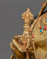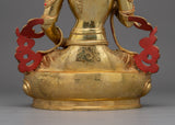 The Buddha of Purification Vajrasattva statue stands at a height of 13 inches (33 cm) and has a base width of 8.7 inches (22 cm). Crafted with a 24K gold gilded finish, complemented by gold and acrylic paintings that enhance its visual appeal. The statue is made from a durable copper body, which adds a sense of timelessness and strength to its presence.