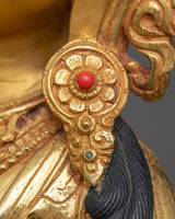 In the statue, the deity is seen sitting on a lotus, looking serene, holding a bell in his left and a vajra in his right hand. We decorated the deity with jewelry, including necklaces, bracelets, and a crown. To draw attention to the deity's expression, we used acrylic paints. The crown and the body ornaments are adorned with precious gemstones.